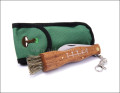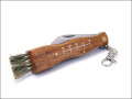 Robustný nôž na huby so zakrivenou, ručne brúsenou čepeľou z nehrdzavejúcej ocele, povinnou kefkou na čistenie húb a mierkou (4 cm) na drevenej rukoväti. Vrátane nylonového puzdra na opasok a kľúčenky.